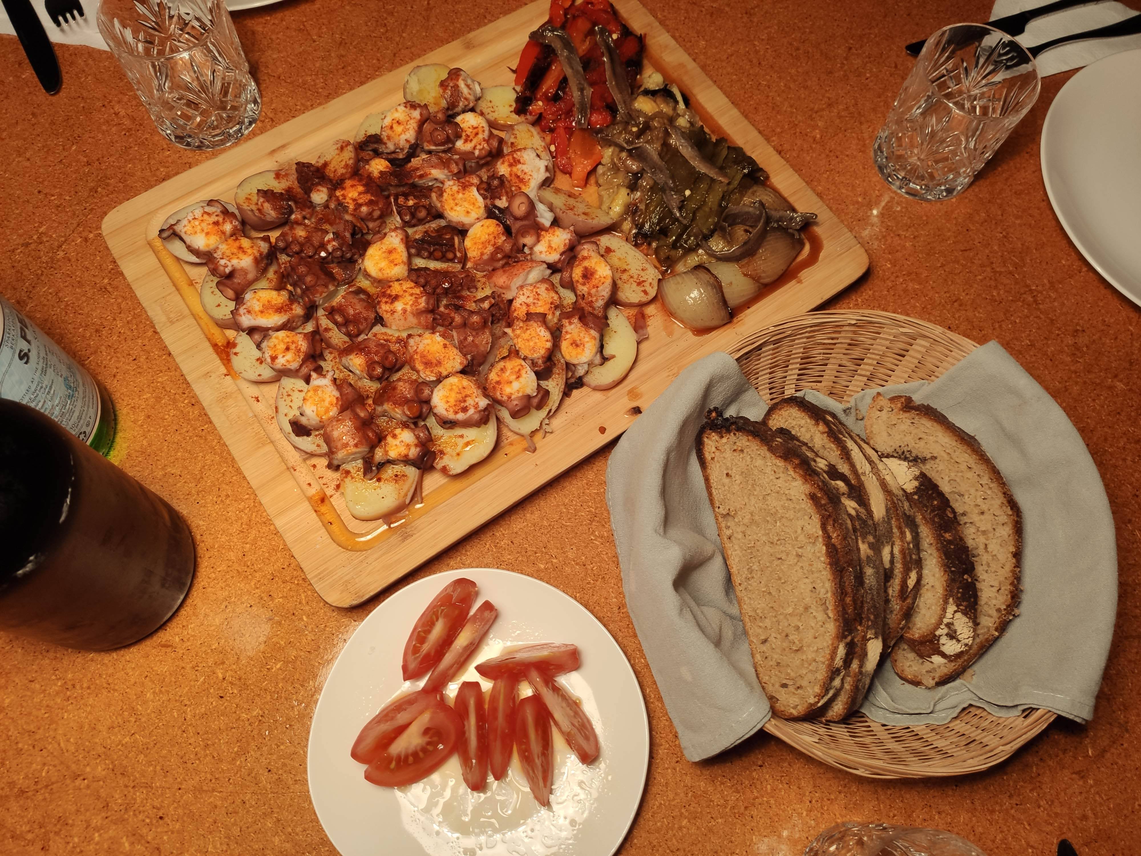 Pulpo a la Gallega, escalivada, sourdough country loaf