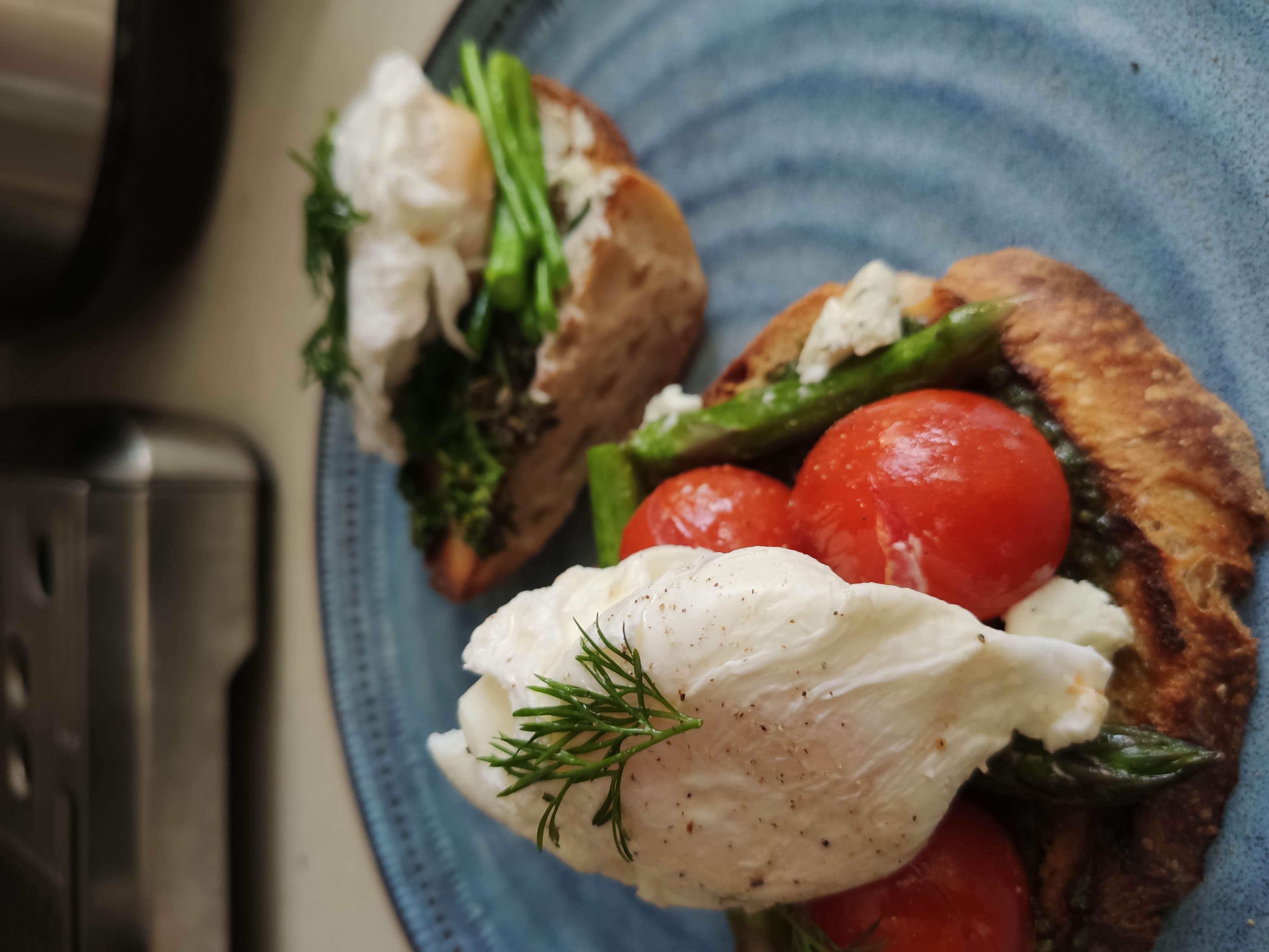 Poached eggs on sourdough with random veg
