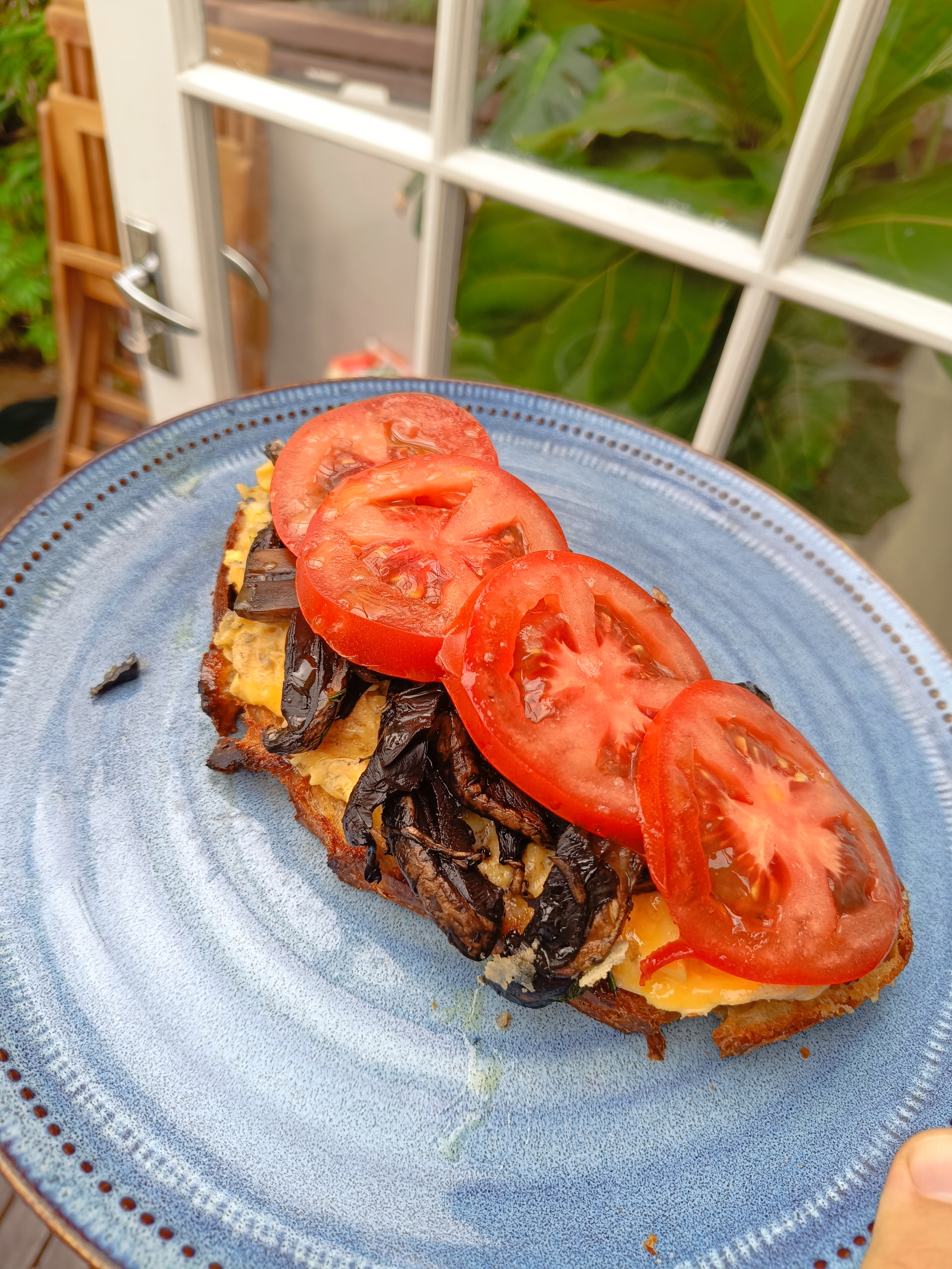 Eggs and mushrooms on toast (salt your tomato)