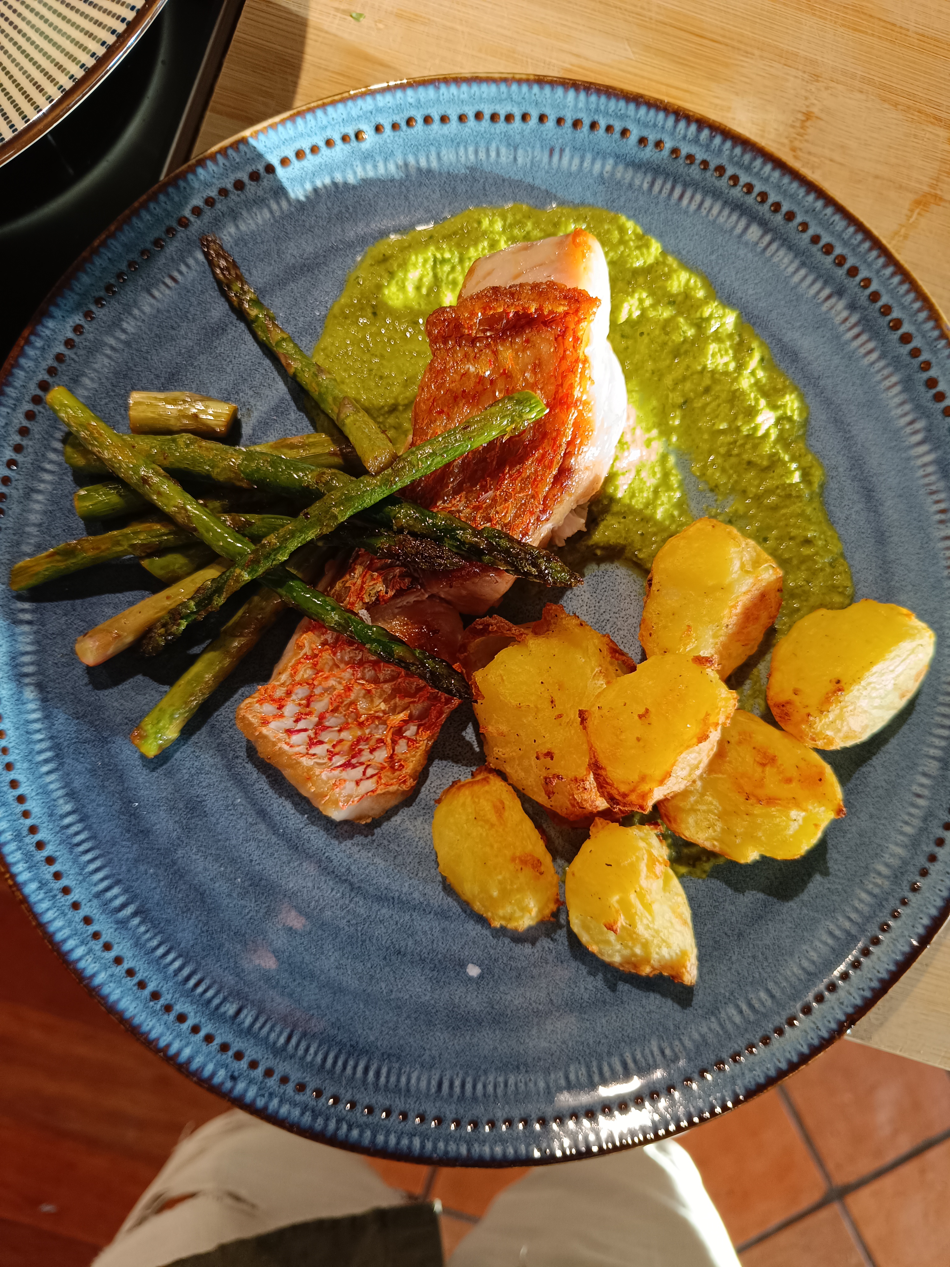 Snapper, kale stem salsa verde, veg